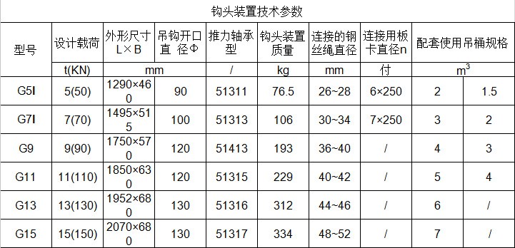 钩头装置分5t, 7t,Ⅱ型钩头装置分9t,11t。