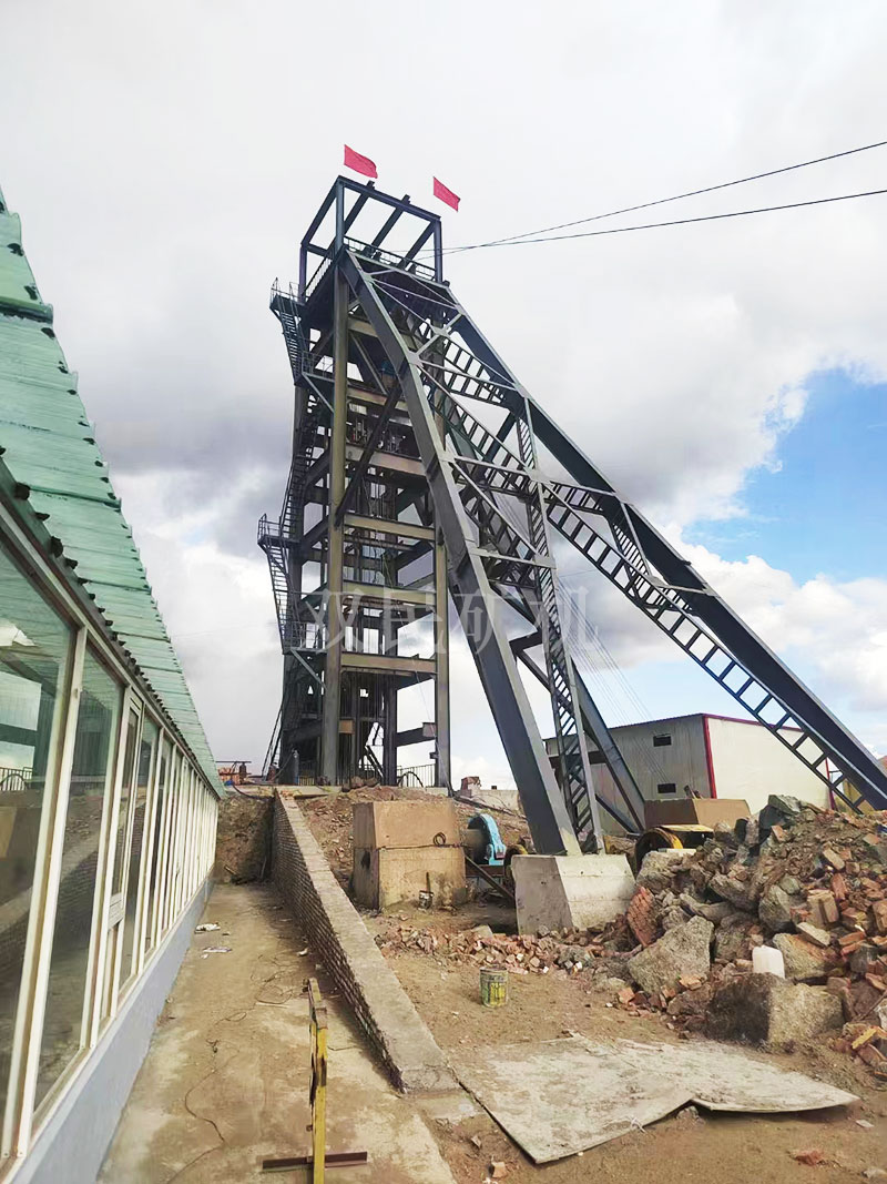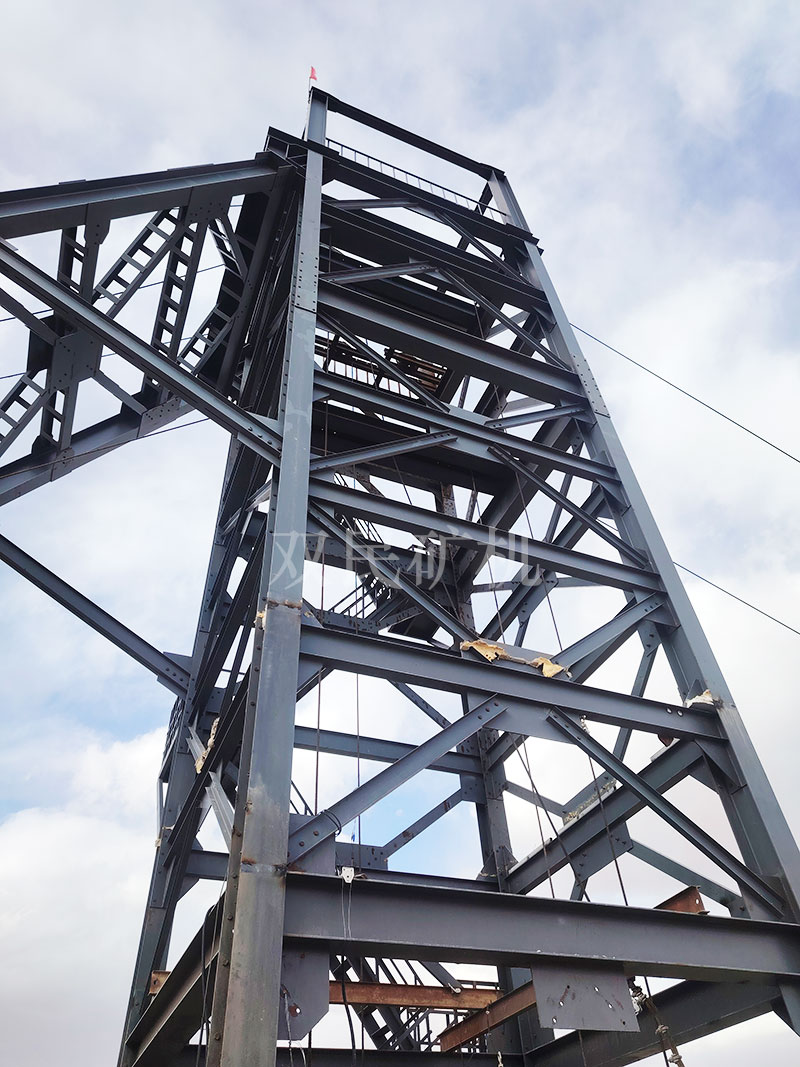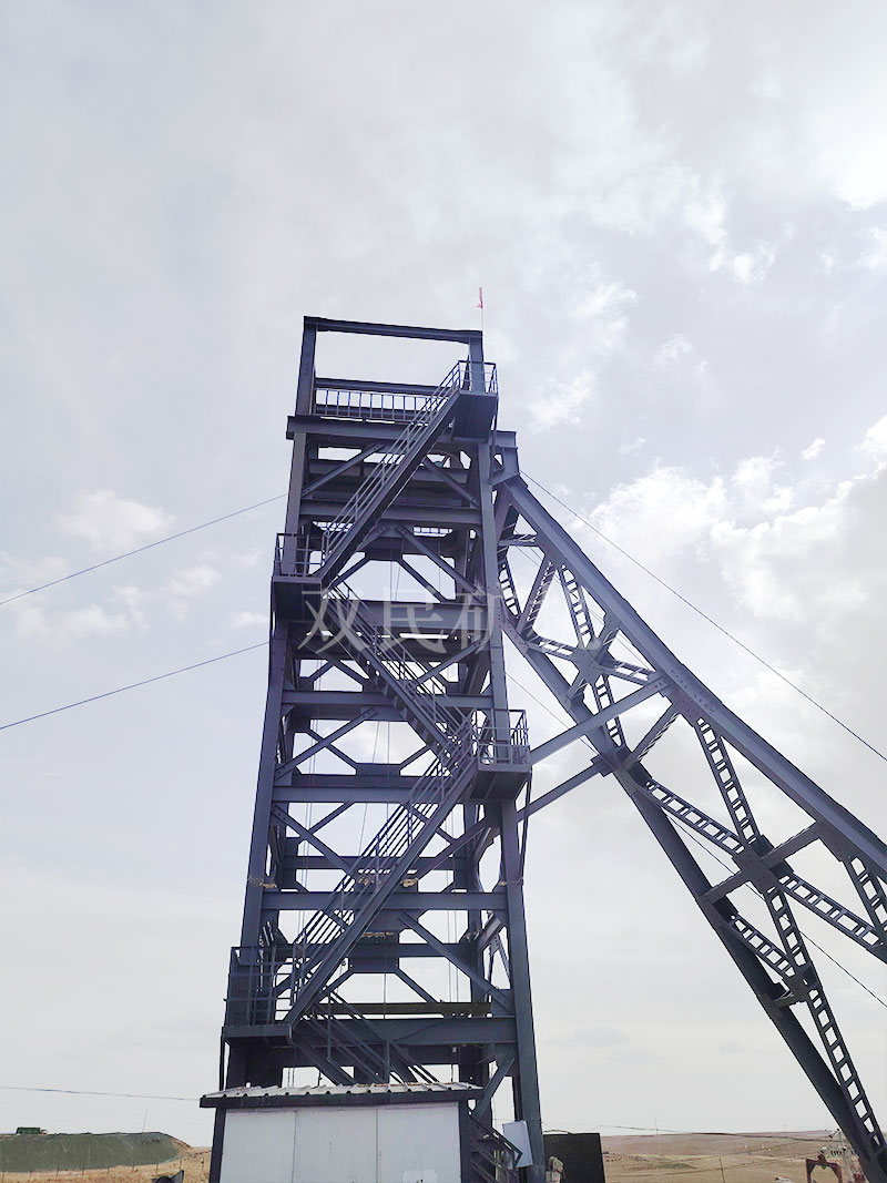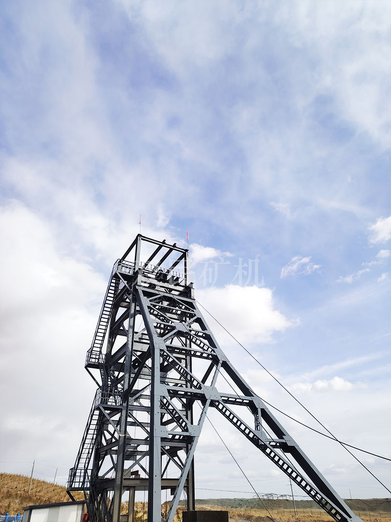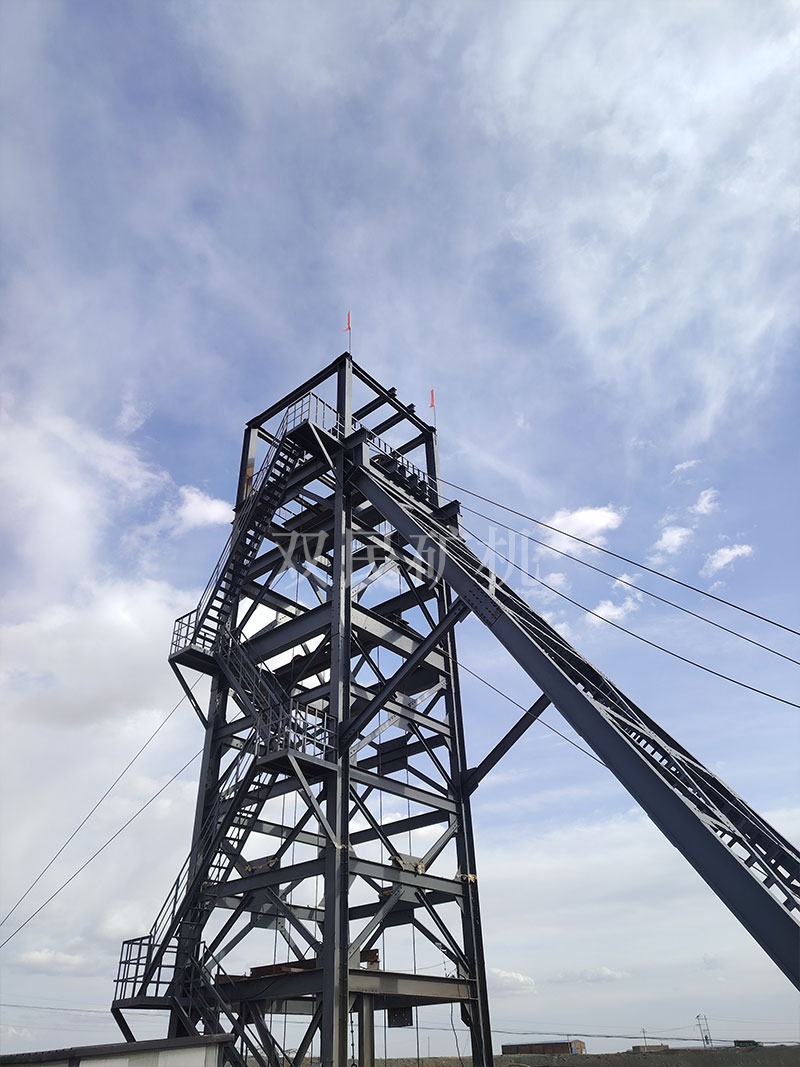 斜撑式永久井架主要特征和优点: 单斜撑式井架是随着落地式多绳地上计技术发展而产生的,具有造型独特,结构简单,受力合理,工程量少,经济实用,技术进步的特点。