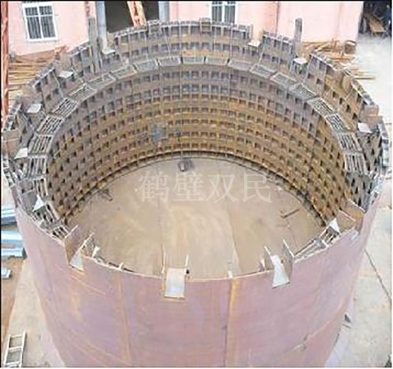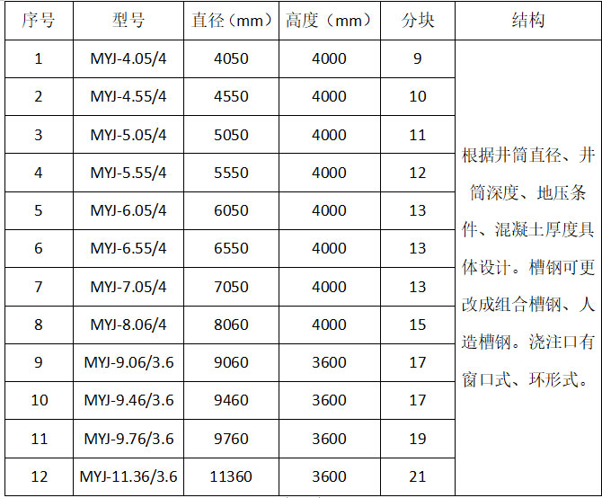 该模板具有刚性大整体强度高,多次拆装后变形量小的特点,液压收缩机构能够灵活的进行脱模、立模。因而,在煤矿和金属矿山井筒砌壁时被广泛使用。