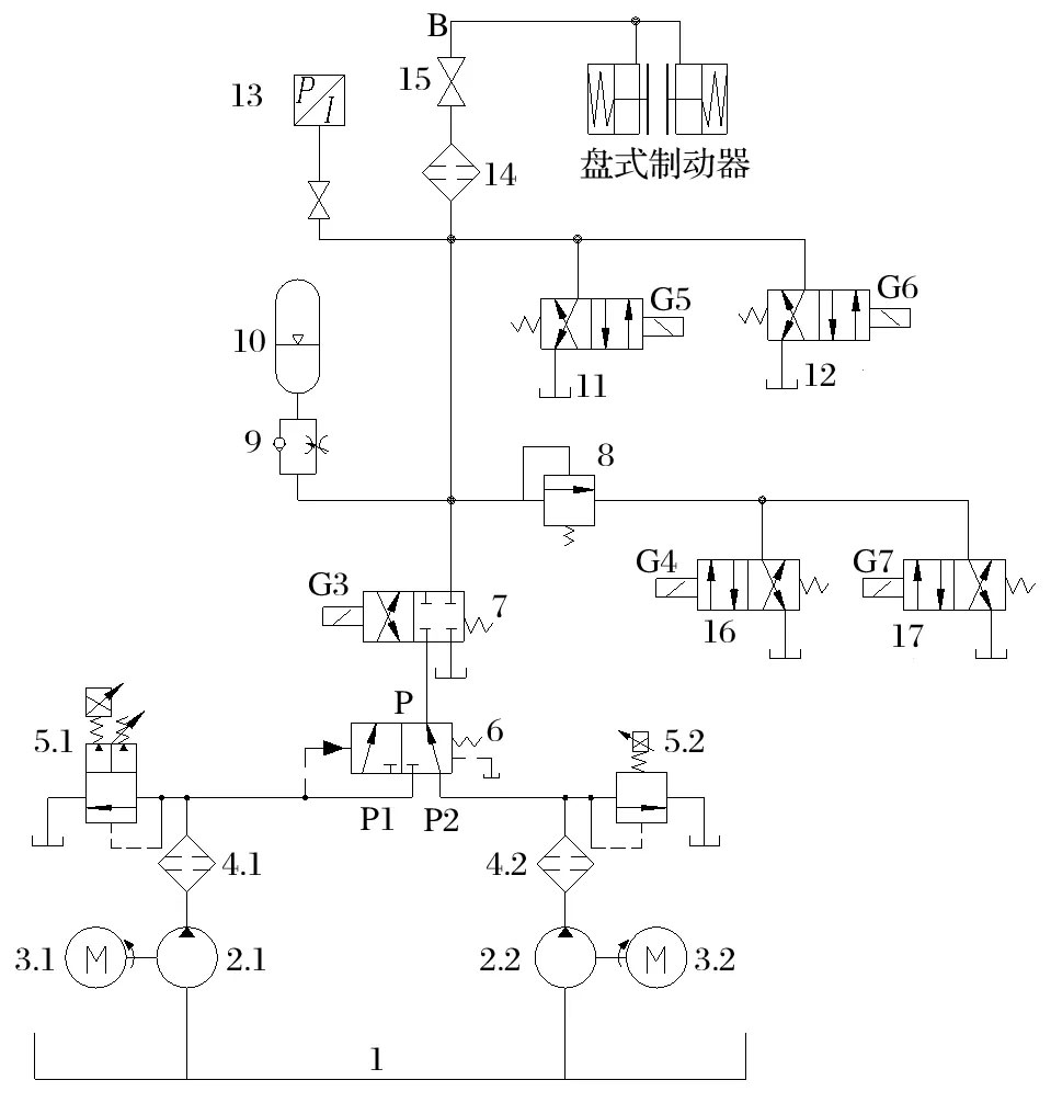 以中信重工生产的恒力矩安全制动双泵液压站为例,其原理如图1 所示。双泵液压站由油箱 1、互为备用的 2 套泵装置、1 套共用的液压阀组组成。其中,泵装置由液压泵 2、电动机 3、过滤器 4、比例溢流阀 5 构成;液压阀组由液动换向阀 6、电磁换向阀(7、11、12、16、17)、溢流阀 8、单向节流阀 9、蓄能器 10、压力传感器 13、过滤器 14、出油口球阀 15构成。连接管路将液压站出油口 B 和盘式制动器连接。