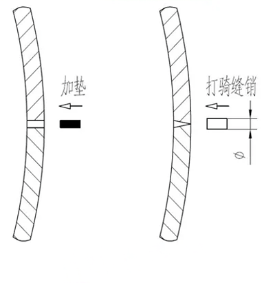 如果缝隙沿筒壳内外均匀,则可以从外侧向缝隙填补薄钢板,并将其固定牢靠;
