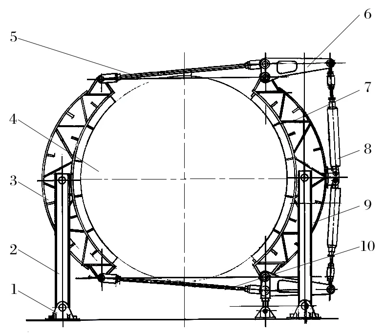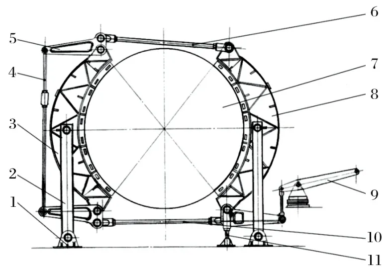 (6)方案简单 对于滚筒直径大于4 m 的旧式提升机,推 荐采用气压-重锤平移式制动器。该改造方案不仅保留了滚筒制动轮构件、基础、前后制动梁,还保留了三角杠杆和顶部拉杆,方案更为简单。以 HKMZ 型提升机为例,改造前后分别如图4、5 所示。对比两图可知,改造量更少,因而成本更低,且造型美观,达到了预期的效果。