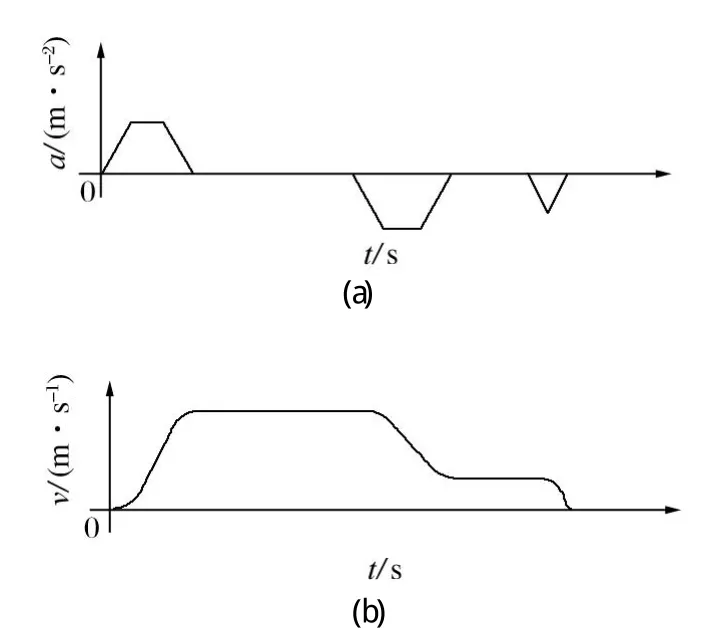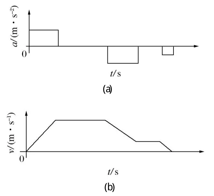 (4)重视提升系统冲击限制,常用的有矩形加/减速度控制和梯形加/减速度控制,分别如图1、2所示。采用梯形加/减速度控制曲线,并且加/减速度的变化率不宜大于 0.3 m/s3,以减少加/减速过程中提升钢丝绳所受的动张力及弹性振动。新建矿井尤其是深井提升系统宜采用恒减速制动,可有效控制紧急制动过程中提升钢丝绳的动张力,同时避免提升钢丝绳打滑现象。
