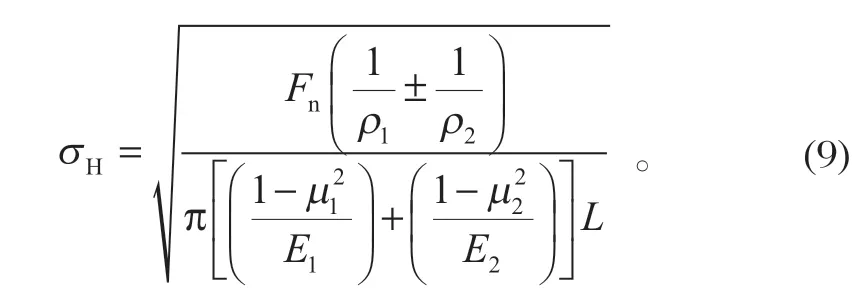 3.2 理论计算Hertz 接触理论是研究疲劳、摩擦及任何有接触体相互作用的基本理论。在齿轮啮合过程中,将齿轮的接触问题等效为两圆柱面的接触问题。赫兹接触应力