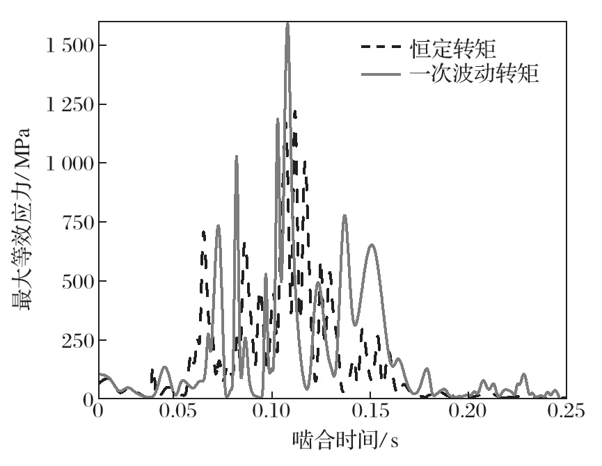 如图12所示,一次波动转矩的zui大等效应力变化趋势基本与恒定转矩的zui大等效应力变化趋势一致,同样是先增 大后减小;但是zui大等效应力幅值变大,甚至超过了材料的屈服ji限。同时,由于一次波动转矩的输出,即使位于双啮合区时,其应力波动相较于恒定转矩输出时的应力波动也是更大。