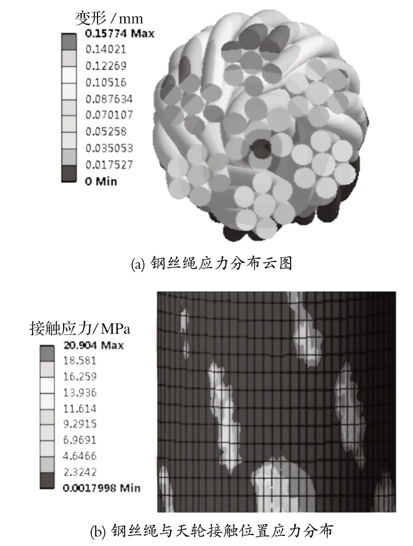 通过仿真结果可以看出,钢丝绳的应力集中在绳芯处,在 Pro/Engineer 中添加求解项,计算钢丝绳股内的变形以及钢丝绳和天轮接触部位的应力,可以得到如图7 所示的计算结果。