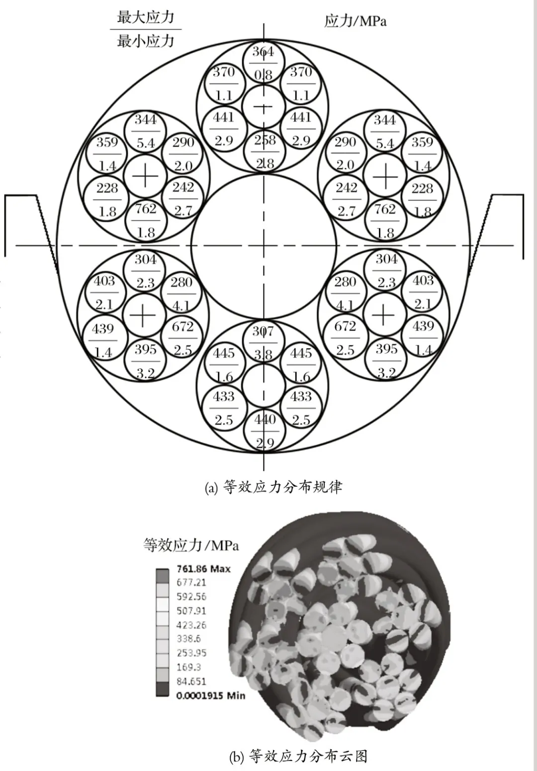 从图6(a) 可以看出,钢丝绳在受载作用时,此时的等效应力呈现出不均匀的分布形式,且存在层状分布;钢丝绳的应力受到空间位置和相位变化的影响,在绳槽的中 心轴线上下部分分布不均匀;从图6(b) 可以看到,钢丝绳截面上应力近似呈现对称层状分布,弹性区域和塑性区域相互交叉。钢丝绳的外股层和接触位置的应力比其他同股的应力较大,此时zui大值为 761.97 MPa,zui大应力分布在靠近中 心轴轴线上半部分的左右两侧。钢丝绳的交互捻外层股二次捻制钢丝绳中,靠近绳芯的位置应力比较大,zui大应力是1 121.78 MPa,分布在绳槽中 心轴线上半部分。通过对比图4 可以看出,zui大应力主要集中在钢丝绳的外侧,不同绳股层的钢丝绳应力值不同。